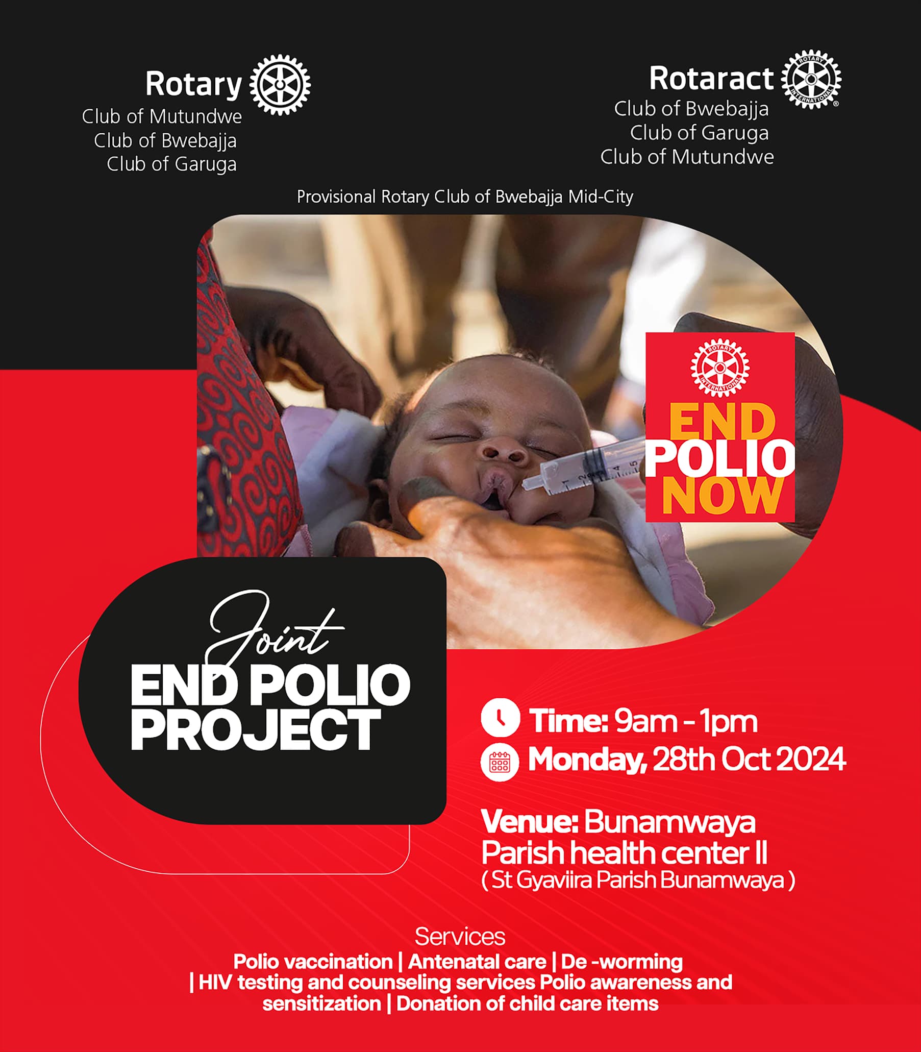Every October, Rotary clubs worldwide rally around a shared mission: Ending Polio. This year, RC Bwebajja, alongside its partners, stood steadfast in this fight, joining hands for a memorable World Polio Day activity on 28th October,2024. Together with the Rotary Clubs of Garuga and Mutundwe, the Provisional RC Bwebajja Mid-City, and three Rotaract clubs—Garuga, Mutundwe, and Bwebajja—their collective effort brought hope and health to the community at Bunamwaya Health Centre II.